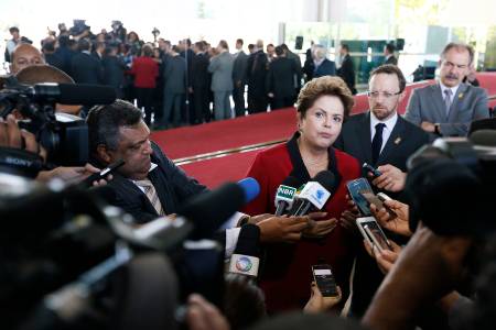 Brazil's President Rousseff speaks to the media after a meeting with India's PM Modi on the sidelines of the 6th BRICS summit at the Alvorada Palace in Brasilia