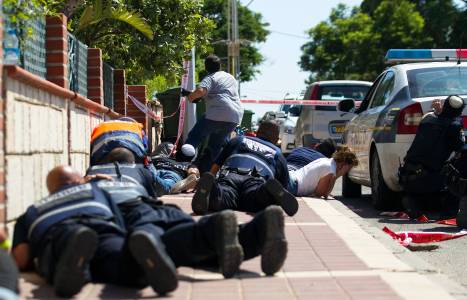 Israeli police and members of the media take cover as a siren sounds, warning of incoming rockets in Ashkelon