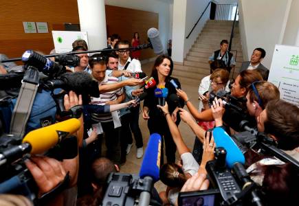 French Culture Minister Aurelie Filippetti speaks to journalists during a news conference about the conflict opposing temporary arts workers and French government during a visit at the Avignon Festival