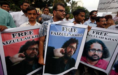 Pakistani journalists carry posters with the picture of local reporter Faizullah Khan, who was detained and imprisoned in Afghanistan, during a protest for his release outside the press club in Karachi July 15, 2014. Television reporter Faizullah Khan has been sentenced to four years imprisonment by an Afghan court for entering Afghanistan without valid travel documents, after he had mistakenly crossed the border and was arrested by Afghan security agencies earlier this year, according to local media. REUTERS/Akhtar Soomro (PAKISTAN - Tags: POLITICS CIVIL UNREST CRIME LAW MEDIA)