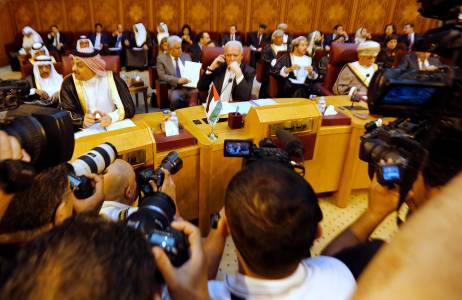 Palestinian Foreign Minister Malki is surrounded by members of the media during an extraordinary session of the Arab League at the league's headquarters in Cairo