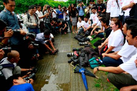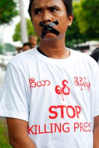 Journalists protest in front of Myanmar Peace Center where Myanmar's President Thein Sein is meeting with Myanmar's film stars, in Yangon