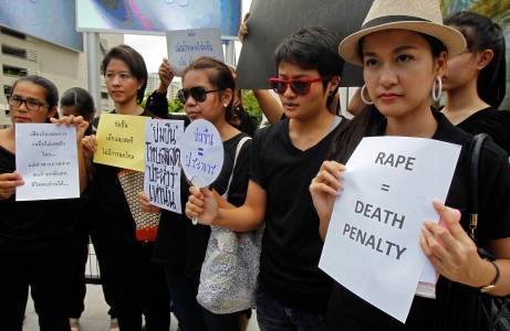 A Thai social media user holds a sign during a rally calling for the death penalty for rapists, outside a shopping mall in Bangkok July 12, 2014. The petition called for the ruling junta to impose a death penalty for convicted rapists. The rape and murder of a 13-year-old girl on an overnight train in Thailand have prompted a nationwide call for stricter enforcement of rape laws and a weekend rally that will defy military restrictions on public gatherings. Penalties for rape in Thailand range from a fine of up to 40,000 baht ($1,200) to life imprisonment or the death penalty but rape laws are rarely enforced. REUTERS/Chaiwat Subprasom (THAILAND - Tags: CRIME LAW POLITICS CIVIL UNREST)