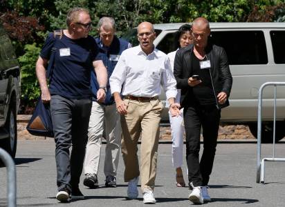 Kering President Pinault, DreamWorks Animation CEO Katzenberg and NV Investments President Nevo leaves on the second day of the Allen and Co. media conference in Sun Valley, Idaho
