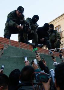 Police officers speak to the media during a protest against the Bolivian government, at their barracks near Murillo Square in La Paz July 3, 2014. Riot police protested against Bolivian President Evo Morales' government and demanded an increase in their wages, reported local media. REUTERS/David Mercado (BOLIVIA - Tags: POLITICS CIVIL UNREST CRIME LAW)