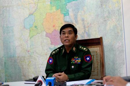 Aung Kyaw Oo, an army colonel in charge of security in the Mandalay region, speaks to the media during a news conference at a division chief police office in in Mandalay