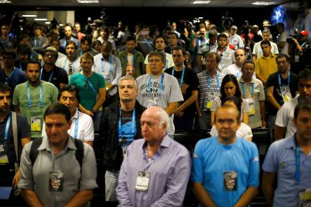 Members of the media take part in a minute's silence in memory of the daughter of Argentinian journalist Miguel "Titi" Fernandez, at the team's training center in Belo Horizonte city, July 2, 2014. According to media reports, the 26-year-old Maria Soledad Fernandez, also a journalist covering the World Cup, was killed in a car crash on Tuesday as she returned from a match in Sao Paulo to Belo Horizonte where Argentina's team was based. REUTERS/Ivan Alvarado (BRAZIL - Tags: SOCCER SPORT WORLD CUP MEDIA TPX IMAGES OF THE DAY)