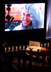 Mourners pay their respects at the coffin of Russian television journalist Klyan during his funeral in Moscow