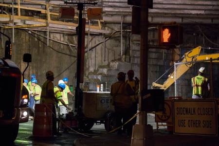 Workers clean up after what local media describe as a stone facade collapsed underneath the Brooklyn Bridge after an unusually strong summer storm in New York July 2, 2014. REUTERS/Lucas Jackson (UNITED STATES - Tags: ENVIRONMENT DISASTER)
