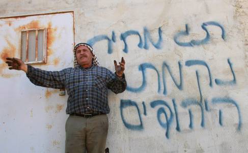 Palestinian farmer Jaber gestures to members of the media in front of Hebrew graffiti which Palestinians said was sprayed by Jewish settlers after burning his property in the West Bank village of Aqraba, near Nablus