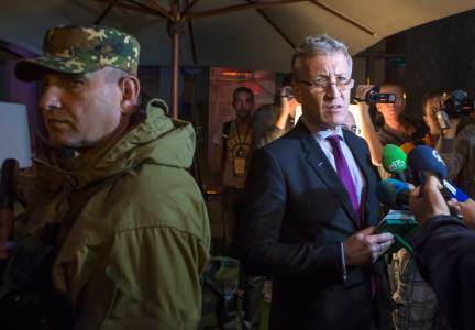 Etherington, Deputy Chief Monitor of OSCE Special Monitoring Mission to Ukraine, speaks to the media after meeting members of his team on their arrival in Donetsk