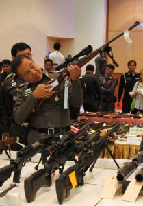 Thai police officers display to the media weapons seized in raids following a military coup on May 22, during a news conference at the military barracks in Bangkok June 29, 2014. The amount of illegal firearms found in the search, arrest and seizure operation that took place from May 22 to June 25 consisted of 1,996 guns, 31,840 rounds of ammunition and 256 explosive devices in total. Of this amount, 144 rifles and machine guns, 258 shotguns, 2,490 pistols, 23 M-79 grenade launchers, 9 rocket-propelled grenade (RPG) launchers, 330 hand grenades and 134 explosive devices such as TNT, were associated with illegal armed groups, according to the Public Relation Center of the Peace and Order Maintaining Task Force. REUTERS/Chaiwat Subprasom (THAILAND - Tags: POLITICS CIVIL UNREST MILITARY CRIME LAW)