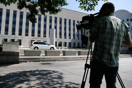 Media start to gather outside the U.S. federal courthouse in Washington