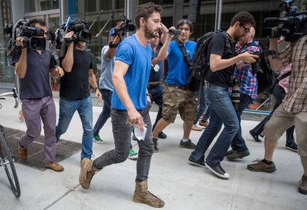 Actor Shia LaBeouf is surrounded by the media as he leaves Midtown Community Court in New York