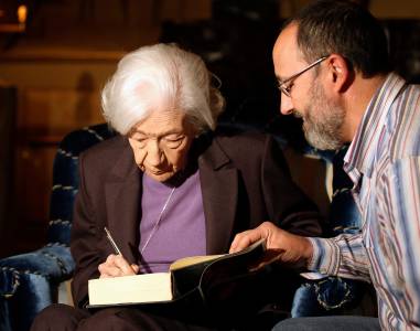 File photo of Spanish author Ana Maria Matute signing an autograph for a journalist before a news conference in Barcelona