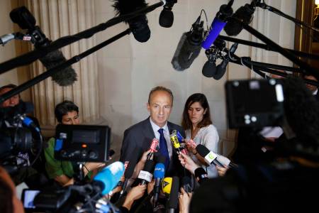 Doctor Eric Kariger, Chief of Palliative Medicine at the Reims CHU hospital, speaks to journalists after the verdict in a judicial case at the Council of State (Conseil d'Etat) in Paris, June 24, 2014. France's top administrative court ruled on Tuesday that doctors should be allowed to take a tetraplegic man off life support after nearly six years in a coma, siding with his wife in a case that has revived a debate about euthanasia. The Council of State ruled that doctors had the right to end the medical support that has kept Vincent Lambert, brain-damaged and in vegetative state, artificially alive since a motorbike accident on the way to work plunged him into a coma in September 2008. The verdict follows a heart-rending battle between Lambert's wife Rachel, seeking to let the former psychiatric nurse die, and his parents, who took legal action last year to halt plans by his doctors to do that. REUTERS/John Schults (FRANCE - Tags: CRIME LAW HEALTH MEDIA HEADSHOT)