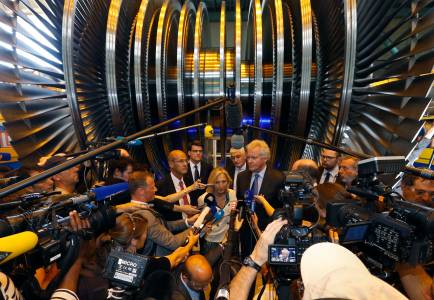 Clara Gaymard, the head of GE France, GE Chairman and CEO Immelt and Alstom Chairman and Chief Executive Kron answer journalists questions as they stand in front off a steam turbine at the turbines production unit of the Alstom plant in Belfort