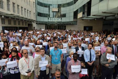 BBC staff and journalists protest the imprisonment in Egypt of Al Jazeera journalists Greste, Fahmy and Mohamed, by taping up their mouths outside New Broadcasting House in London