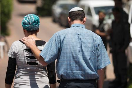 Bat-Galim and Ofir Shaer, parents of Gil-Ad, one of three missing teens, walk towards their home after addressing the media in Talmon