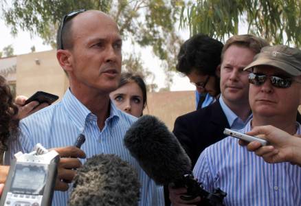 Andrew Greste, brother of Australian Peter Greste, talks to journalists outside a court after a court ruling in Cairo June 23, 2014. Three Al Jazeera journalists were jailed for seven years in Egypt on Monday after a court convicted them of helping a "terrorist organisation" by spreading lies, in a case that has raised questions about the country's respect for media freedoms. The three, who all deny the charge, include Australian Peter Greste, Al Jazeera's Kenya-based correspondent, and Canadian-Egyptian national Mohamed Fahmy, Cairo bureau chief of Al Jazeera English. The third defendant, Egyptian producer Baher Mohamed, received an additional three-year jail sentence on a separate charge involving possession of ammunition. REUTERS/Asmaa Waguih (EGYPT - Tags: POLITICS CRIME LAW SOCIETY)
