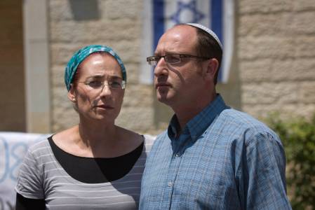 Bat-Galim (L) and Ofir Shaer, parents of Gil-Ad, one of three missing Israeli teens, address the media outside their home in the West Bank Jewish settlement of Talmon June 23, 2014. Israel's army said it detained another 37 Palestinians overnight as it searched for the three missing teenagers and extended a crackdown on the Hamas Islamist group it accuses of kidnapping them. REUTERS/Finbarr O'Reilly (WEST BANK - Tags: CIVIL UNREST POLITICS)