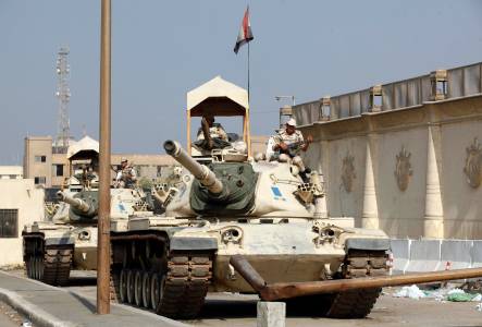 Soldiers guard outside of Tora Prison where al-Jazeera journalists are tried at a court in Cairo June 23, 2014. Three Al Jazeera journalists were jailed for seven years in Egypt on Monday after a court convicted them of helping a "terrorist organisation" by spreading lies, in a case that has raised questions about the country's respect for media freedoms. The three, who all deny the charge, include Australian Peter Greste, Al Jazeera's Kenya-based correspondent, and Canadian-Egyptian national Mohamed Fahmy, Cairo bureau chief of Al Jazeera English. The third defendant, Egyptian producer Baher Mohamed, received an additional three-year jail sentence on a separate charge involving possession of ammunition. REUTERS/Asmaa Waguih (EGYPT - Tags: POLITICS CRIME LAW SOCIETY)