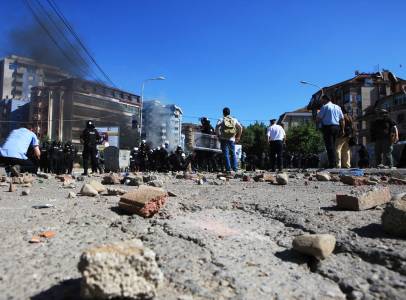Police and journalists stand amidst rocks thrown by Kosovo Albanians during a protest in the ethnically divided town of Mitrovica June 22, 2014. Police in Kosovo fired tear gas and rubber bullets on Sunday at ethnic Albanian rioters burning police cars and lobbing rocks in Mitrovica, in protest over the blockage of the main bridge by ethnic Serbs. REUTERS/Hazir Reka (KOSOVO - Tags: POLITICS CIVIL UNREST MEDIA)