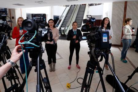 Local media report from a court where Mircea Basescu (not pictured), brother of Romania's President Traian Basescu, is being issued a 30-day arrest warrant pending a criminal investigation in Bucharest June 20, 2014. A Romanian court issued a 30-day arrest warrant for President Traian Basescu's brother on Friday pending a criminal probe for allegedly taking a bribe to help keep an underworld boss out of jail, his lawyer told reporters declining other comment. Anti-corruption prosecutors had asked for the warrant against Mircea Basescu in a corruption case that has prompted leftist Prime Minister Victor Ponta to call for the president's resignation, four months before a November 2 presidential election. REUTERS/Bogdan Cristel (ROMANIA - Tags: CRIME LAW POLITICS MEDIA)