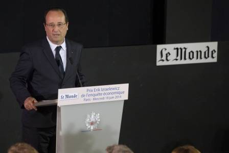 French President Francois Hollande delivers a speech during a ceremony to award journalists with the Erik Izraelewicz prize for economic stories in Paris, June 18, 2014. REUTERS/Philippe Wojazer (FRANCE - Tags: POLITICS MEDIA)