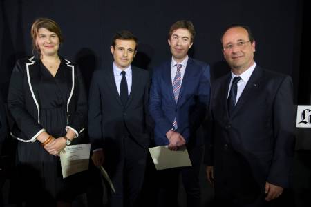 French President Francois Hollande (R) poses with award winners (L-2ndR), student category Emmanuelle Bour, special jury award Yves Martinet and professional category Renaud Honore, during a ceremony to award journalists with the Erik Izraelewicz prize for economic stories in Paris, June 18, 2014. REUTERS/Philippe Wojazer (FRANCE - Tags: POLITICS MEDIA)