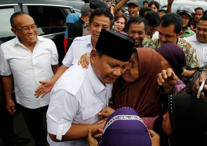 File picture shows a woman embracing Indonesia's presidential candidate Subianto as Golkar Party chief and media mogul Bakrie watches during a campaign in Bandung