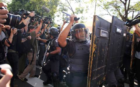 Media take pictures as military police clash with demonstrators during a protest against the 2014 World Cup, in Sao Paulo