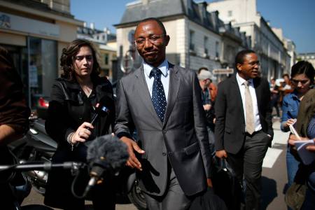 Apolin Pepiezep (L), lawyer of Mehdi Nemmouche, 29, the French national who is suspected of the shooting attack in the Brussels Jewish Museum last month that left four people dead, speaks to the journalists after a hearing for his client's extradition outside the Appeal Court of Versailles, near Paris, June 12, 2014. REUTERS/Benoit Tessier (FRANCE - Tags: CRIME LAW MEDIA)