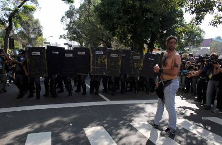 Media take pictures as demostrator stands in front of Military police protest against the 2014 World Cup in Sao Paulo