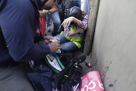 A journalist working for CNN receives medical attention after being injured in clashes between demostrators and mlitary police during a protest against the 2014 World Cup, in Sao Paulo June 12, 2014. REUTERS/Ricardo Moraes (BRAZIL - Tags: SPORT SOCCER WORLD CUP POLITICS CIVIL UNREST MEDIA)