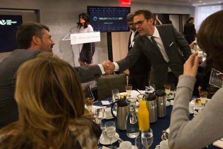 James Murdoch, co-chief operating officer of 21st Century Fox (R), shakes hands with guests ahead of a dialogue at the Paley Center for Media in Manhattan, New York May 30, 2014. REUTERS/Adrees Latif (UNITED STATES - Tags: ENTERTAINMENT BUSINESS MEDIA)