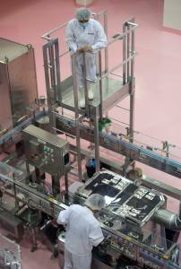 Workers look over Yakult drinks on the assembly line during a media tour of a the first Yakult probiotic drink factory opened in the United States in Fountain Valley, California