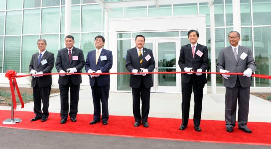 Officials cut the ribbon in the ribbon cutting ceremony during a media tour of a the first Yakult probiotic drink factory opened in the United States in Fountain Valley, California