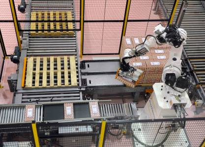 A robot lifts packages of Yakult on to a pallet on the assembly line during a media tour of a the first Yakult probiotic drink factory opened in the United States in Fountain Valley, California