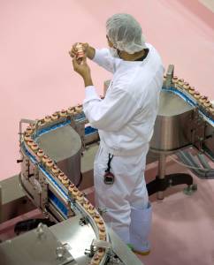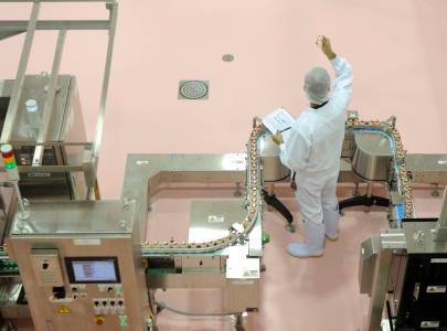 A worker looks at a Yakult drink on the assembly line during a media tour of a the first Yakult probiotic drink factory opened in the United States in Fountain Valley, California