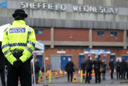 A police officer stands in front of members of the media during a visit by Hillsborough Inquest jurors to the Hillsborough stadium in Sheffield