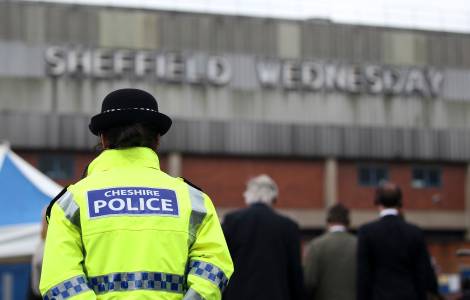 A police officer stands in front of members of the media during a visit by Hillsborough Inquest jurors to the Hillsborough stadium in Sheffield May 23, 2014. Lord Justice Goldring is leading the inquest into the 1989 Hillsborough disaster, that claimed the lives of 96 men, women and children. REUTERS/Lynne Cameron/pool (BRITAIN - Tags: CRIME LAW DISASTER SPORT SOCCER OBITUARY)
