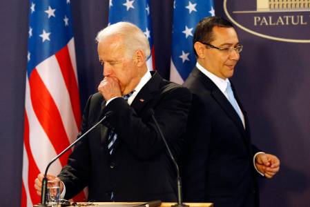 Romania's Prime Minister Victor Ponta (R) stands next to U.S. Vice President Joe Biden talking at a media briefing at Victoria palace in Bucharest May 21, 2014. Biden warned Russia on Wednesday that undermining a May 25 presidential election in Ukraine would bring greater costs for Russia - already subject to Western sanctions since its annexation of Crimea. REUTERS/Bogdan Cristel (ROMANIA - Tags: POLITICS CIVIL UNREST ELECTIONS)