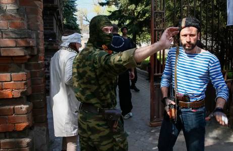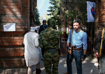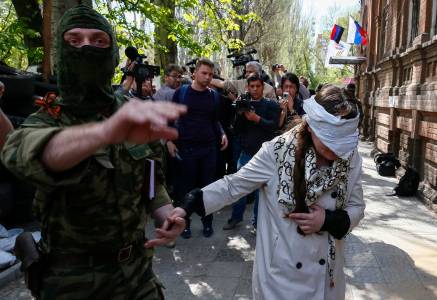A pro-Russian armed man escorts Ukrainian journalist Krat after news conference in Slaviansk