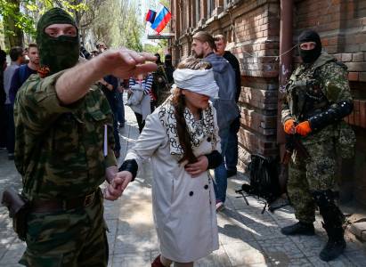 A pro-Russian armed man escorts Ukrainian journalist Irma Krat after news conference in Slaviansk, April 21, 2014. Pro-Russian separatists in eastern Ukraine have detained a Ukrainian journalist, accusing her of "war crimes" during the "Euromaidan" protests that toppled the Moscow-backed president, her lawyer said on Monday. Krat, 29, was held late on Sunday by militants in the city of Slaviansk, said Oleg Veremienko, a lawyer for the online television news site Krat runs. Russian Internet channel Life News posted video of her being escorted by masked men in combat gear and of an activist saying she was under arrest. REUTERS/Gleb Garanich (UKRAINE - Tags: POLITICS CIVIL UNREST)