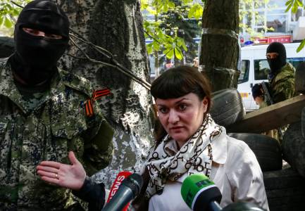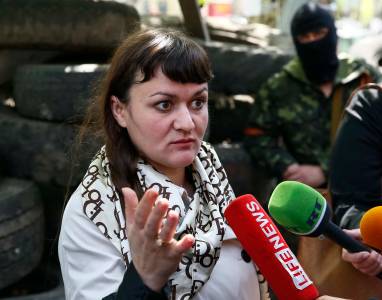 Ukrainian journalist Irma Krat speaks with journalists in Slaviansk, April 21, 2014. Pro-Russian separatists in eastern Ukraine have detained a Ukrainian journalist, accusing her of "war crimes" during the "Euromaidan" protests that toppled the Moscow-backed president, her lawyer said on Monday. Krat, 29, was held late on Sunday by militants in the city of Slaviansk, said Oleg Veremienko, a lawyer for the online television news site Krat runs. Russian Internet channel Life News posted video of her being escorted by masked men in combat gear and of an activist saying she was under arrest. REUTERS/Gleb Garanich (UKRAINE - Tags: POLITICS CIVIL UNREST MEDIA)