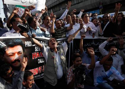 Pakistani journalists and cameramen chant slogans during a protest, called by Pakistan Federal Union of Journalist (PFUJ), against the attack on television anchorperson Hamid Mir, outside the press club in Karachi