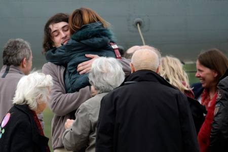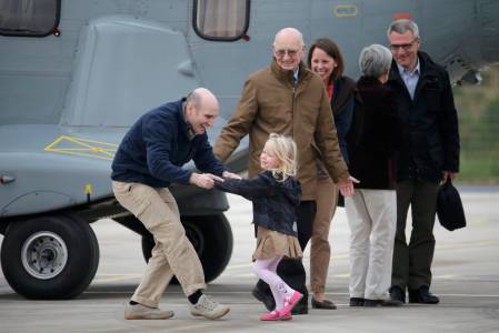 Former hostage, French journalist Edouard Elias is greeted by relatives as he arrives by helicopter from Evreux to the military airbase in Villacoublay
