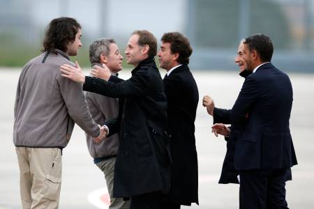 Namias, director of French radio Europe 1, and Lagardere, head of French media group Lagardere greet former hostages, French journalists Francois and Elias at military airbase in Villacoublay