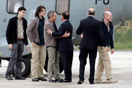 French President Hollande speaks with former hostages, journalists Francois, Elias, Henin holding his children and Torres, moments after their arrival at military airbase in Villacoublay